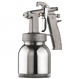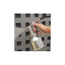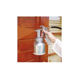 - Pistola presurizada con boquilla de mezcla interna que permite trabajar con un bajísimo consumo -sólo 65 L/min- y muy baja presión -1-2 bar-.
